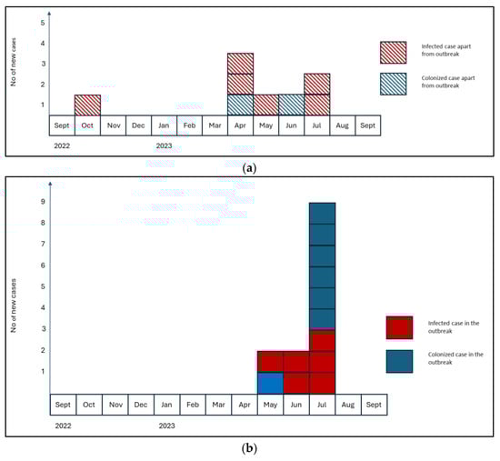(a) Histogram of C. auris onset of illness, apart from outbreak. (b) Histogram of C. auris onset of illness in the outbreak.