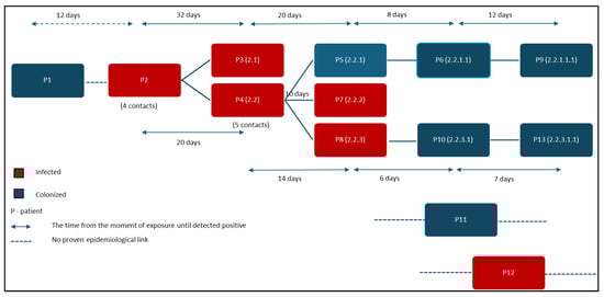 Positive patients were labeled based on the chronological order of their detection, from P1 to P13 (Figure 1b). Once a link between cases was found, we further categorized them through filiation, keeping the index case number followed by a new case number (Figure 3).