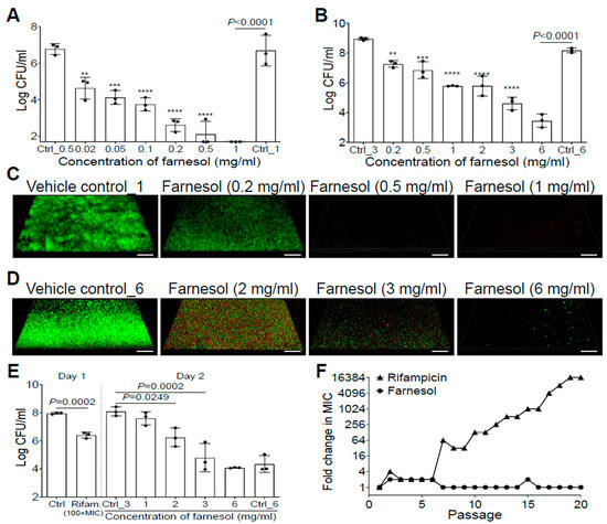 8 CFU/mL for established biofilm) in chambers of a 4-well Lab-Tek™ chambered coverglass (Nunc, Waltham, MA, USA) precoated with 500 µL of human plasma or rat tail collagen as described above. After 24 h incubation in a humidified container, planktonic cells were removed, and biofilms were washed with 500 µL of sterile water (for biofilm formation) or PBS (for established biofilms). The established biofilms were then exposed to 500 µL of farnesol in medium for an additional 24 h in a humidified container, then detached cells were removed, and adherent biofilms were further washed with 500 µL of sterile water. Established biofilms were stained for 20–30 min at room temperature with 250 µL of a mixture containing 10 µM of SYTO