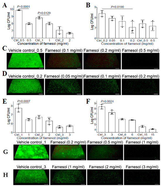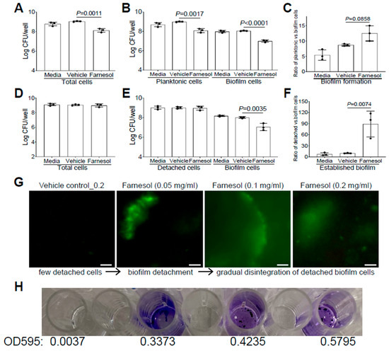 Single biofilms were established by culturing 250 µL of NB1/TSB containing innocula (1 × 108 CFU/mL) in a plasma/collagen-pre-coated 96-well plate at 37 °C. For established polymicrobial biofilms, 250 µL of mixed Xen29 and Xen5 innocula (1 × 107 CFU/species/well) was cultured in TSB containing 5% BSA. After a 24 h incubation in a humidified container, planktonic cells were removed, and the established biofilms were washed with 250 µL of PBS, and then exposed to 100 µL of various final concentrations of farnesol in media. After an additional 24 h incubation in a humidified container, floating cells were removed, adherent biofilms were washed with 100 µL of PBS, and dislodged in 100 µL of PBS by vigorous (≥10 times) pipetting, and the CFU/mL of viable bacteria was determined by serial dilutions and drop plating. Biofilms were exposed to the same amount of ethanol in media as a vehicle control. The lower limit of detection was 50 CFU/mL. To visualize the data on a logarithmic scale, a value of 50 CFU/mL was assigned when no growth occurred.