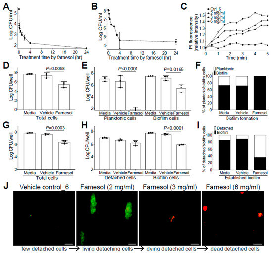 For established biofilms, 24 h old biofilms of S. aureus Xen29 were established as above. The washed biofilms were then exposed to 100 µL of NB1 containing 6 mg/mL of farnesol in a humidified container. After incubation at 37 °C for 0, 15, and 30 min, or 1, 2, 3, 4, and 24 h, media were removed and adherent biofilms were washed with 100 µL of PBS, then dislodged in 100 µL of PBS by vigorous (≥10 times) pipetting, and the CFU/mL of viable bacteria was determined by serial dilution and drop plating.