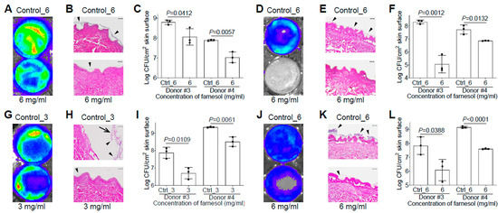 For skin infection experiments, 50 µL of a bacterial inoculum with various concentrations of farnesol [1 × 106 CFU/mL (for Xen29) or 1 × 105 CFU/mL (for Xen5) to evaluate the inhibition of biofilm formation, or 1 × 108 CFU/mL (for Xen29) or 1 × 107 CFU/mL (for Xen5) for established biofilms] was evenly distributed onto the intact or burned skin. The plates were incubated at 37 °C and 5% CO2 for 24 or 48 h in a humid chamber. Skin samples were then imaged by an in vivo imaging system (IVIS, PerkinElmer, Waltham, MA, USA). For treatment of 24 h old established biofilms, 100 µL of farnesol in medium was evenly distributed onto the established biofilms on skin surfaces and then incubated at 37 °C and 5% CO2 for an extra 24 h. The samples were then imaged as above. As a control, samples were exposed to the vehicle without farnesol.