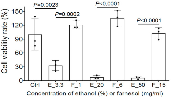 CellTiter 96® AQueous One Solution Cell Proliferation (MTS) assay (Promega, Madison, WI, USA) was used to determine the viability of HEKa (ATCC) when exposed to farnesol. Cells (5000/cm2) were cultured with 200 µL of keratinocyte-serum free medium (Gibco) in a collagen-coated 96-well plate to form a monolayer (≥70% of confluence) in a 37 °C, 5% CO2, humidified incubator. The medium was aspirated, cells were washed with 200 µL of PBS, and then incubated with 200 µL of medium containing 1, 6, or 15 mg/mL of farnesol. Cells were exposed to medium only, or medium containing the same amount of vehicle without farnesol as medium and vehicle controls. After 24 h incubation, the medium was aspirated, and the attached cells were washed with 200 µL of PBS, followed by the addition of 100 µL of MTS solution which had been diluted 1:4 with medium. The plate was incubated in the 37 °C, 5% CO2, humidified incubator for 2–4 h, while protected from light. The optical density at 490 nm was then measured using a TECAN Infinite M200 microplate reader with the MTS solution alone as a blank.