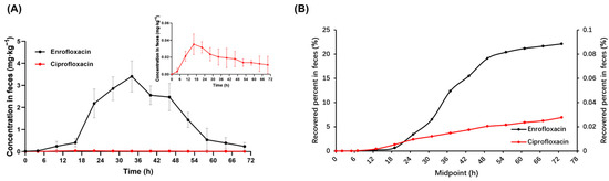 The excretion of enrofloxacin and its metabolite ciprofloxacin in the feces of donkeys after a single intragastric administration of 7.5 mg·kg−1 BW, n = 5: (A) Plots of mean concentrations in feces of enrofloxacin and its metabolite ciprofloxacin vs. time in donkeys. (B) Plots of the recovered percent of enrofloxacin and its metabolite ciprofloxacin in feces vs. midpoint in donkeys. Midpoint, the midpoint of the sampling start and end times.