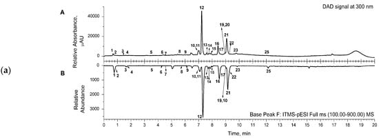 Representative chromatograms (from DAD and MS detectors) are shown in Figure 1. for the aqueous (a) and acetone (b) extracts. The corresponding chromatograms for the ethanol extract were similar to the ones for the acetone extract. Several classes of compounds were detected and identified in the samples of the extracts (Table 2). Three main classes, phenylethanoid glycosides (comp. no. 5, 8, 10–16, 22), phenolic acids and their derivatives (comp. no. 1, 6, 7, 9), and flavonoids (comp. no. 17–21, 23–25), were detected in the extracts. Two octadecadienoic acids (trihydroxy- and hydroxy-octadecenoic acid—comp. no. 26 and 27, respectively) and two flavonoid compounds, luteolin-7-O-glucoside and luteolin (comp. no. 18 and 24, respectively), were detected only in acetone and ethanol extracts (Table 2).