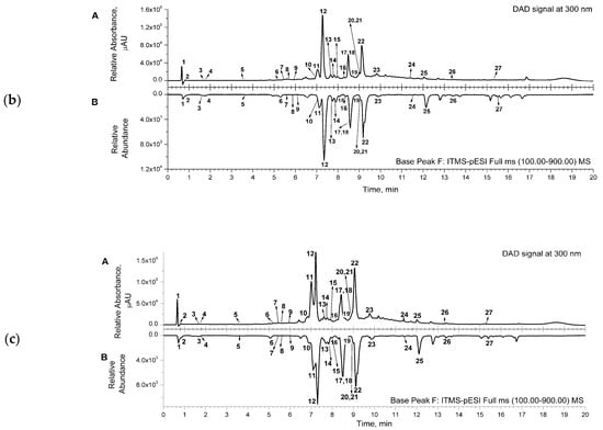 (a) Representative UHPLC chromatogram of aqueous extract, recorded from DAD signal at 300 nm (A); mirrored UHPLC chromatogram in range of base peak from MS detection (B). (b) Representative UHPLC chromatogram of acetone extract, recorded from DAD signal at 300 nm (A); mirrored UHPLC chromatogram in range of base peak from MS detection (B). (c) Representative UHPLC chromatogram of ethanol extract, recorded from DAD signal at 300 nm (A); mirrored UHPLC chromatogram in range of base peak from MS detection (B). Numbers marked under the peaks are in accordance with the same ones given in Table 2 for the detected compounds.