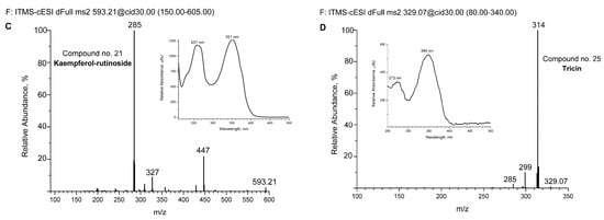 For some of the major detected compounds, the corresponding UV-Vis and MS/MS spectra are shown in Figure 2A for two phenylethanoid glycosides (echinacoside and verbascoside—comp. no. 12 and 16, respectively) and two flavonoids (kaempferol-rutinoside and tricin—comp. no. 21 and 25, respectively).