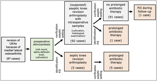 In 92 (94.8%) patient cases, the preoperative aspirate was negative for the presence of PJI. Therefore, aseptic revision of the unicompartmental prosthesis was performed (Figure 1).