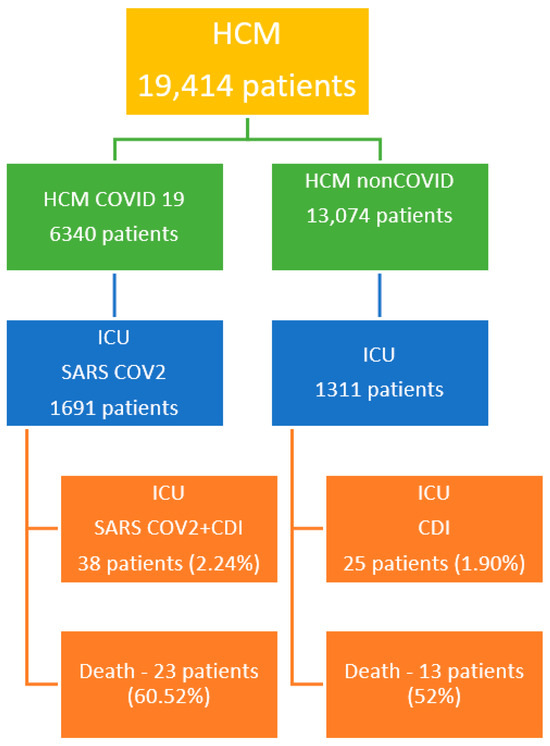 In the two years, between 30 March 2020 and 31 March 2022, a total of 19,414 patients were admitted in Mures County Clinical Hospital (HCM), from which 6340 patients were admitted with different forms of COVID-19 and 368 patients were diagnosed with CDI. In the ICU, without PACU, a total of 3002 critical patients were admitted: 1691 with SARS-CoV-2 infection; 1311 non-COVID-19 patients, of which 62 presented with CDI; and 38 had a coinfection with CDI and SARS-CoV-2.
