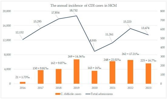 We analyzed two types of data: the incidence of CDI for Mures County Clinical Hospital in the 2016–2023 period and the comparative analysis of the two groups, coinfection with SARS-CoV-2 and CDI group and CDI group, during the two-year period.