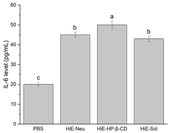 IL-6 levels after 18-hour stimulation of Caco-2 cells with PBS, HiE-Neu, HiE-HP-β-CD, and HiE-Sol. Different letters (a–c) within the bars indicate statistical difference (p < 0.05).