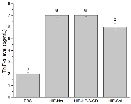 TNF-α level after 18 h stimulation of Caco-2 cells with systems, where 1. PBS, 2. HiE-Neu, 3. HiE-HP-β-CD, 4. HiE-Sol. Different letters (a–c) within the bars indicate statistical difference (p < 0.05).