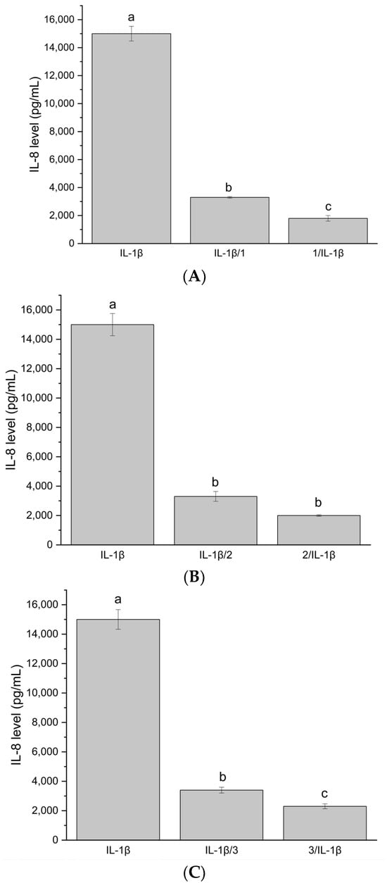 (A) IL-8 level after stimulation of Caco-2 cells with system HiE-Neu at a concentration of 100 μg/mL. (B) IL-8 level after stimulation of Caco-2 cells with system HiE-HP-β-CD at a concentration of 100 μg/mL. (C) IL-8 level after stimulation of Caco-2 cells with system HiE-Sol at a concentration of 100 μg/mL. Different letters (a–c) within the bars indicate statistical difference (p < 0.05).