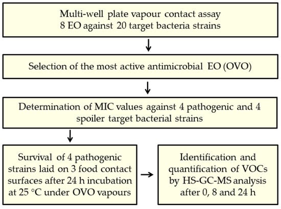 Experimental set up followed to define the most promising EO vapors to control microbial contamination of food-contact surfaces.