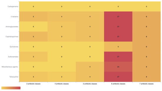Heatmap showing the multiple resistance profiles of CTX-resistant E. coli isolates isolated from rabbit farms. The resistance to six different classes of antibiotics and seven different classes of antibiotics had highest association with the number of isolates in comparison to resistant to three, four and five different classes of antibiotics. The grading numbers in color strip depicts the number of different classes of antibiotics. The copy number, ranging from 0 to 27, was indicated by yellow to red.