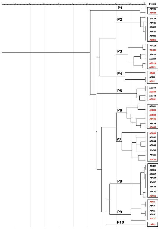 Phylogenetic group A was the most prevalent (56.25%), followed by group B1 (37.5%) and group D (2.08%). The 48 isolates analyzed belonged to 10 different pulsotypes (Figure 2). The sequence types (ST) were determined among 19 E. coli strains (at least one strain per PFGE pattern) using the MLST method. Seven different ST were observed: ST10, ST457, ST1611, ST2325, ST2825, ST8470, and ST8823.