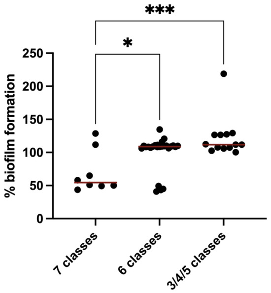 A microtiter plate assay was used to measure the biofilm production in all 48 CTX-resistant E. coli strains isolated. All isolates showed biofilm formation. To ensure consistency, the results were normalized against E. coli ATCC 25922. Figure 3 shows the biofilm formation of each isolate grouped by resistance phenotype (seven different classes of antibiotics, six classes of antibiotics and three/four/five classes of antibiotics). Strains belonging to three/four/five classes of antibiotics had a significantly higher average biofilm formation rate (p < 0.001) and showed the highest biofilm production, followed by those belonging to six classes of antibiotics (p < 0.05) and those belonging to seven classes of antibiotics (p < 0.001). The strain with the highest biofilm formation belonged to the group resistant to three/four/five classes of antibiotics, and the strain that produced the least biofilm mass belonged to the group resistant to 7 classes of antibiotics.