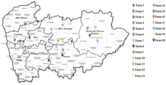 Geographic locations of rabbit farms. Samples were collected from 20 rabbit farms in the Trás-os-Montes, Alto Tâmega, Douro, Ave, and Minho regions. Each farm is marked in a different color.