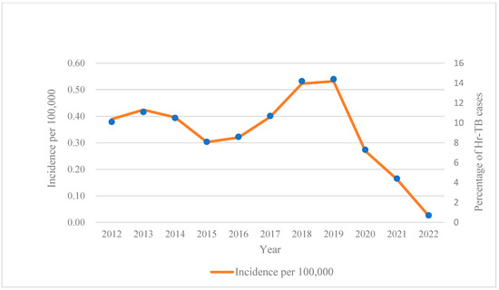 Annual incidence of Hr-TB per 100,000 during 2012–2022 in Jiangsu province. Abbreviation: Hr-TB, isoniazid-resistant, rifampicin-susceptible tuberculosis.