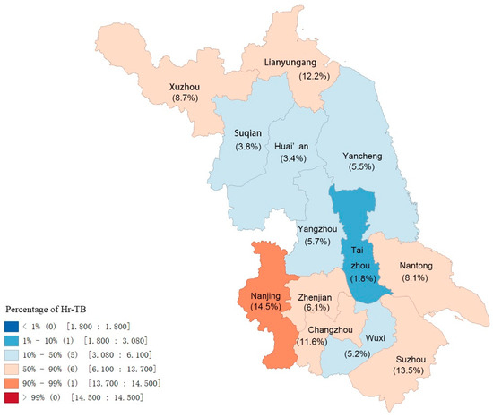 Distribution of Hr-TB in Jiangsu province depending on percentage. Abbreviation: Hr-TB, isoniazid-resistant, rifampicin-susceptible tuberculosis.
