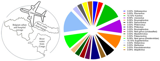 A total of 13 P. aeruginosa and 11 K. pneumoniae phages were newly isolated from urban (the international terminal of Brussels (Zaventem airport)) and hospital sewage and environmental waters (Figure 1 and Table 1 and Table 2). The bacterial matrix included 102 P. aeruginosa strains with different genetic backgrounds and 155 K. pneumoniae strains representing 36 Klebsiella capsular serotypes (Tables S1 and S2). In total, the newly isolated phages belonged to 18 different genera, according to genome analysis.