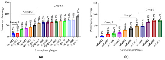 (a) P. aeruginosa host range (%); (b) K. pneumoniae host range (%).