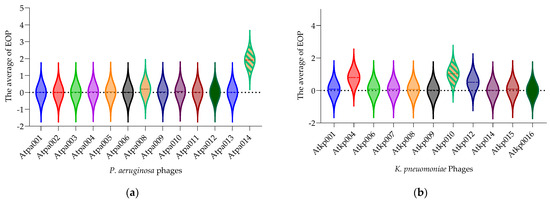 Figure 3 (each violon plot) shows the average of each phage EOP (efficiency of plating) on the tested bacterial panel (P. aeruginosa (n = 102) and K. pneumoniae (n = 155)). The EOP value is in the range of 0.0005–1.9 for P. aeruginosa and 0.01–1.0 for K. pneumoniae phages. Figure 3 shows only the phages isolated in this study. The relevant EOP results (the ratio of the titer (cfu/mL) produced on a test bacterial strain to the phage titer of a propagating bacterial host strain) for all P. aeruginosa and K. pneumoniae phages, separately, are given in the Supplementary Materials (Figures S1–S25).