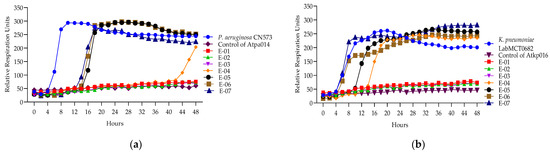 Ninety-six-well microtiter plates were prepared as follows: 180 µL of LB was added to each test well. Ten-fold serial dilutions of phage samples were made to a dilution factor of 10-9. Twenty microliters of bacterial suspension with an OD600 of 0.003 (P. aeruginosa) or 0.002 (K. pneumoniae), corresponding to 2.10 + 6 cfu/mL, was added to each test well (except the “phage only” and “LB only” control wells). Finally, 100% v/v Redox Dye Mix H (100X) (Biolog #74228) was added to all wells at a final concentration of 1%. The plate layout (Figure 17a) included “phage only”, “bacteria only” and “LB only” controls, and all experiments and controls were performed in triplicate wells. Test plates were immediately incubated in the OmniLog system (Biolog, Hayward, CA, USA) at 37 °C for 24 h or 48 h. A possible reduction (causing a color change) in the tetrazolium dye due to bacterial respiration was monitored and recorded every 15 min by the OmniLog system. Bacterial growth is expressed in relative respiration units (rru).