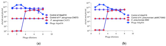 Enumeration of bacteria (cfu/mL) and phages (pfu/mL) after 24 h of incubation (Appelmans assay). (a) P. aeruginosa strain CN573 and phage Atpa014. (b) K. pneumoniae strain LabMCT0682 and phage Atkp016.