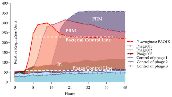Here, we developed the interpretation model curve for PLC (phage liquid culturing) experiments (Figure 6). OmniLog Data Analysis Software (v1.7) was used for data collection and visualization of kinetic assay results. The interpretation of the generated bacterial proliferation curves was performed as follows (Figure 6): 1. A relative respiration unit (rru) in the range of 0–60 was considered to be as indicative of the phage clearing (CL) effect (absolute lysis) based on the experimental results averaged for phage controls. 2. Bacteria–phage growth curve that did not have the same shape as the control bacterial growth curve and resulted in a higher rru was considered as phage-resistant mutant (PRM) growth. 3. Bacterial proliferation curve with shorter exponential phase and reduced and constant rru maintained up to 48 h compared to bacterial control was evaluated as an indication of bacterial inhibition (In) effect by phage.