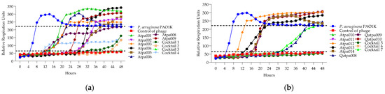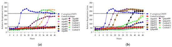 (a) Lytic activity curves of P. aeruginosa phage’s Atpa001–Atpa009 and cocktails 1–4 on PAO1K; (b) lytic curves of P. aeruginosa phage’s Atpa009–Atpa014, Qatpa008–Qatpa010 and cocktails 5–7 on PAO1K.