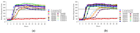 (a) The lytic activity curves of P. aeruginosa phage’s Atpa001–Atpa009 and cocktails 1–4 cocktails 5–7 on PA7; (b) the lytic activity curves of P. aeruginosa phage’s tpa009–Atpa014, Qatpa008–Qatpa010 and cocktails 6–7 on PA7.