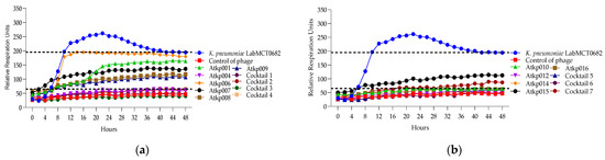 (a) Lytic activity curves of K. pneumoniae phage’s Atkp001–Atkp009 and cocktails 1–4 on LabMCT0682; (b) lytic activity curves of K. pneumoniae phage’s Atkp009–Atp016 on LabMCT0682.