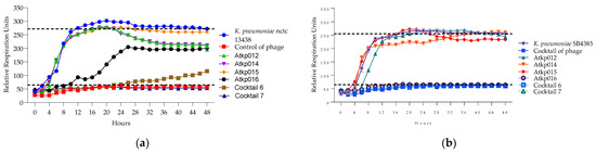 (a) Lytic activity curves of K. pneumoniae phage’s Atkp012–Atkp016 and cocktails 6–7 on nctc 13438; (b) lytic activity curves of K. pneumoniae Atkp012–Atkp016 and cocktails 6–7 on SB4385.