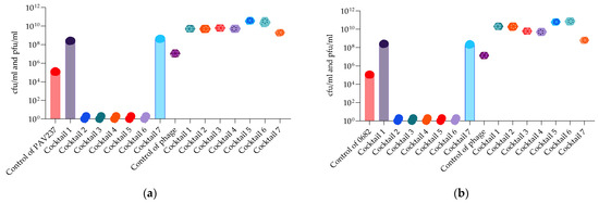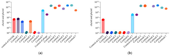 Bacterial (cfu/mL) and phage (pfu/mL) counts after 48 h of OmniLog incubation for 7 P. aeruginosa phage cocktails and strains: (a) PAO1K; (b) CN573. Bars with the spere symbols represent cfu/mL, and the hexagonal symbols without bars represent pfu/mL.