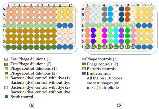 (a) OmniLog plate layout for the Appelmans’ method; (b) OmniLog plate layout for the lytic activity evaluation of individual phages or phage mixtures.