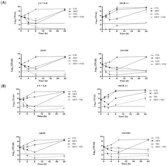 Time–kill curves of colistin (A) and/or tigecycline (B) alone and combined with tamoxifen metabolites, at plasmatic mouse Cmax, against Escherichia coli C1-7-LE (colistin-susceptible), E. coli MCR-1+ (colistin-resistant), Acinetobacter baumannii Ab#9 (tigecycline-susceptible), and A. baumannii Ab#186 (tigecycline-resistant) strains. Empty triangle: growth control (CTL); inverted filled triangle: tamoxifen metabolite mix (MET); empty circle: colistin (COL); cross: COL + MET; empty square: tigecycline (TIG); asterisk: TIG + MET; dotted line: bactericidal activity.