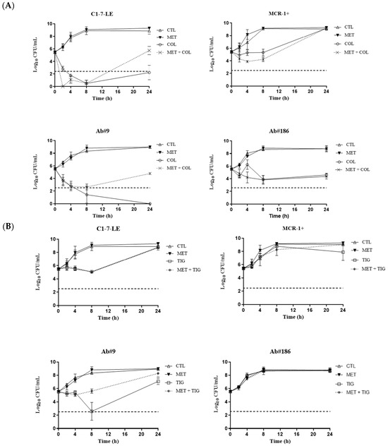 Time–kill curves of colistin (A) and tigecycline (B) alone and combined with tamoxifen and metabolite mix, at MIC concentrations, against the Escherichia coli C1-7-LE (colistin-susceptible), E. coli MCR-1+ (colistin-resistant), Acinetobacter baumannii Ab#9 (tigecycline-susceptible), and A. baumannii Ab#186 (tigecycline-resistant) strains. Empty triangle: growth control (CTL); inverted filled triangle: tamoxifen metabolite mix (MET); empty circle: colistin (COL); cross: COL + MET; empty square: tigecycline (TIG); asterisk: TIG + MET; dotted line: bactericidal activity.