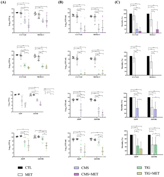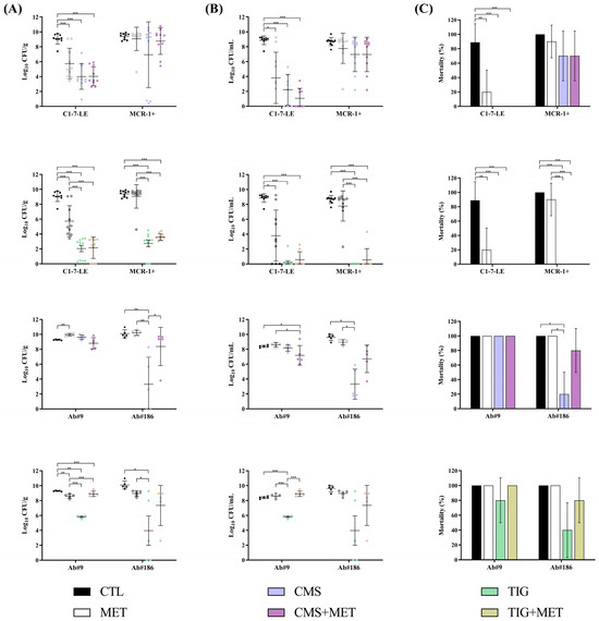 Efficacy of colistimethate sodium or tigecycline monotherapies alone and in combination with the tamoxifen metabolite mix in the peritoneal sepsis model of Escherichia coli C1-7-LE (n = 10, colistin-susceptible), E. coli MCR-1+ (n = 10, colistin-resistant), Acinetobacter baumannii Ab#9 (n = 5, tigecycline-susceptible), and A. baumannii Ab#186 (n = 5, tigecycline-resistant). Black dots and columns: control (CTL) groups; white dots and columns: metabolite mix (MET) groups; blue dots and columns: colistimethate sodium (CMS) groups; purple dots and columns: CMS in combination with MET groups; green dots and columns: tigecycline (TIG) groups; yellow dots and columns: TIG in combination with MET groups. (A) Efficacy of CMS and TIG monotherapies alone and in combination with MET in terms of spleen bacterial concentrations (means ± SD); (B) efficacy of CMS and TIG monotherapies alone and in combination with MET on blood bacterial concentrations (means ± SD); (C) efficacy of CMS and TIG monotherapies alone and in combination with MET in terms of mortality (means ± 95% CI). * p < 0.05; ** p < 0.01; *** p < 0.001.