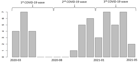 The number of first identified P. aeruginosa infections each month among 51 patients admitted to the intensive care unit (ICU) for ARDS due to COVID-19 during the three initial waves.