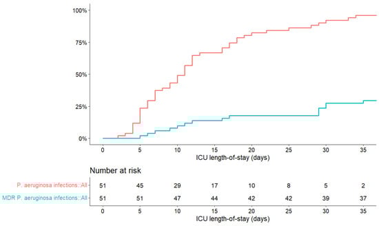 During these three waves, the median delay between the first diagnosis of COVID-19 and the identification of a P. aeruginosa infection among patients was 14 days (Q1–Q3: 10–25). The first identification of a P. aeruginosa infection occurred after a median ICU stay of 11 days (Q1–Q3: 6–18). After one month (30 days) in the ICU, 90% of patients were infected with P. aeruginosa, and 24% were infected with MDR P. aeruginosa (Figure 2).