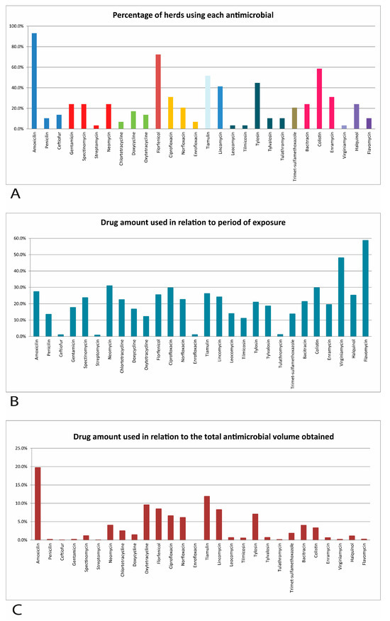 Percentage of herds using different antimicrobials (A) and proportion used in relation to the period of exposure (B) and in relation to the total quantity used (C) in the commercial full-cycle pig farms evaluated in the central region of the state of Minas Gerais.