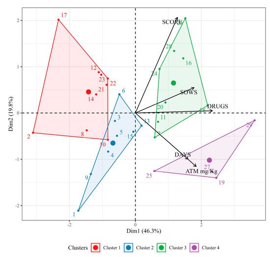 The principal component analysis (PCA) resulted in two dimensions explaining 66.10% of the data variance. Dimension 1 accounted for 46.34% and was basically explained by the quantity of antimicrobials used (33.72%), while dimension 2 accounted for 19.76% and was explained by the biosecurity score (61.87%). The formation of principal component groups (clusters), made with the HCPC method, resulted in four clusters, characterized in Table S2 and represented in Figure 3.