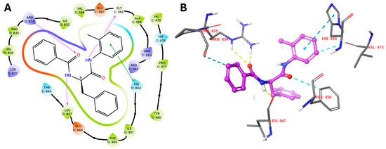 D-AAP1 target interactions based on PDB: 5UHE. (A) Two-dimensional summary of interactions. Purple arrows: hydrogen bonds; green lines: pi stacking interaction. (B) Three-dimensional depiction of the binding pose. Yellow dashed lines: hydrogen bonds, blue dashed line: pi stacking interaction; turquoise dashed line: aromatic hydrogen bonds. Visualization generated with the Maestro graphical interface (Schrödinger Release 2022-3: Maestro, Schrödinger, LLC, New York, NY, USA, 2021).