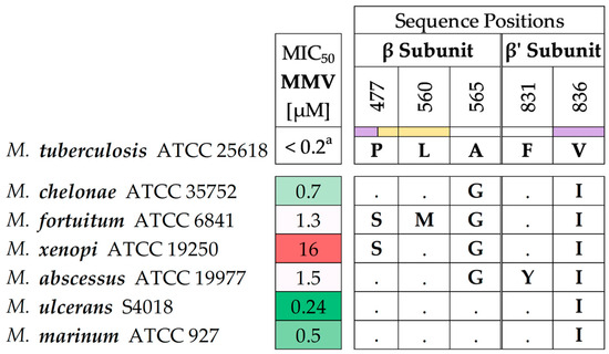 Variations in β and β′ RNAP subunits of mycobacterial strains compared to Mtb (sequence numbering refers to Mtb β and β′ subunits derived from PDB: 5UHE). Violet indicators show positions with direct drug-target contacts. Yellow indicators show positions that resulted in resistant M. abscessus Bamboo mutants (P477L; L560P). Dots represent amino acid identity. Green indicates above-average activity of the respective compound, while red indicates below-average activity. a: Published MIC50 value for M. tuberculosis ATCC 25618 [22].