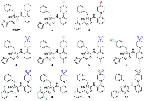 The compounds selected for assessment against the strains described in this study were synthesized and characterized as described previously [25,32]. The selection of the test set considered their activity against previously tested mycobacteria, as well as diverse structural features that could affect the activity against different NTM species. Compounds 1 to 7 were synthesized during a detailed SAR study that varied the ring systems of the chemical scaffold in the search for better activity against NTM. The morpholine moiety was substituted by thiomorpholine sulfoxides and sulfones, which proved advantageous for the activity and solubility of the compound class, in addition to the exchange of the thiophene carboxylic acid amide to 2-fluorobenzoic acid amides. Compound 6 was included because it showed high activity while harbouring the hydroxyl group [25]. We also wanted to determine the influence of 5-fluoro substitution in para-position to the morpholine moiety (compounds 4 to 6). Compounds 8 to 10 showed high anti-NTM activity and have been synthesized and tested in a previous study with the aim to improve the stability of the compound class by additional sterical hindrance of the amide bonds [32]. The molecular structures of the tested compounds are given in Scheme 1 while their previously published activities against NTM can be found in Table 1. For comparative purposes, the initial hit compound of phenylalanine amides, MMV688845 (MMV), was included. Additionally, clarithromycin (CLR) was used as a positive control due to its clinical relevance.