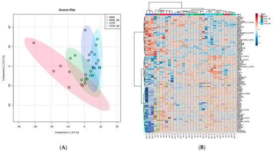 PLSDA (A) and the heat map with dendrogram resulting from hierarchical cluster analysis (B) of proteins extracted from spleen samples obtained from BMD, BMD-SE, CON, and CON-SE group broiler chickens (n = 4). The PLSDA score plot demonstrates distinct sample clusters based on BMD, BMD-SE, CON, and CON-SE groups, while the heat maps visualize the 100 most distinguishing proteins, with greater abundance indicated in red and lesser abundance in blue, relative to BMD (red), BMD-SE (green), CON (blue), and CON-SE (light blue) groups.