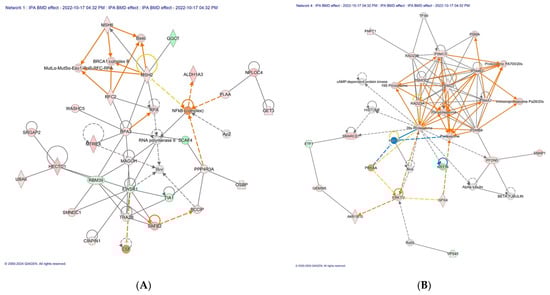 The top scoring IPA protein networks DNA replication, recombination, and repair, cancer, gastrointestinal disease (A), infectious diseases, organismal injury and abnormalities, and cancer (B) are depicted for overall BMD treatment. In the figure, red denotes upregulation while green indicates downregulation, with color intensity reflecting the relative magnitude of change in protein expression. Solid lines represent direct interactions, whereas dashed lines signify indirect interactions. The protein interaction networks were constructed using QIAGEN Ingenuity Pathway Analysis, https://www.qiagenbioinformatics.com/products/ingenuity-pathway-analysis/ (accessed on 17 October 2022).