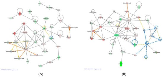 The top scoring IPA protein networks cancer, dermatological diseases and conditions, RNA post-transcriptional modification (A), cellular assembly and organization, molecular transport, and RNA trafficking (B) are depicted for BMD treatment X Salmonella challenge. In the figure, red denotes upregulation while green indicates downregulation, with color intensity reflecting the relative magnitude of change in protein expression. Solid lines represent direct interactions, whereas dashed lines signify indirect interactions. The protein interaction networks were constructed using QIAGEN Ingenuity Pathway Analysis, https://www.qiagenbioinformatics.com/products/ingenuity-pathway-analysis/ accessed on 17 October 2022.