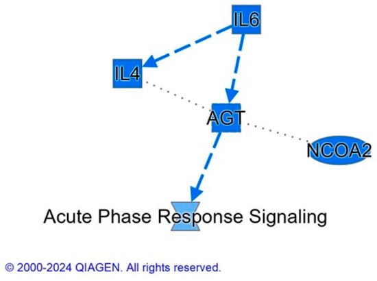IPA summary graph of the effect of BMD on spleen proteome. Blue color indicates a prediction that the following molecules: IL6 (interleukin-6), IL4 (interleukin-4), AGT (angiotensinogen), NCOA2 (nuclear receptor co-activator 2), and acute phase response signaling are inhibited. The protein interaction networks were constructed using QIAGEN Ingenuity Pathway Analysis https://www.qiagenbioinformatics.com/products/ingenuity-pathway-analysis/ accessed on 17 October 2022). Dashed lines represent an indirect relationship between molecules.